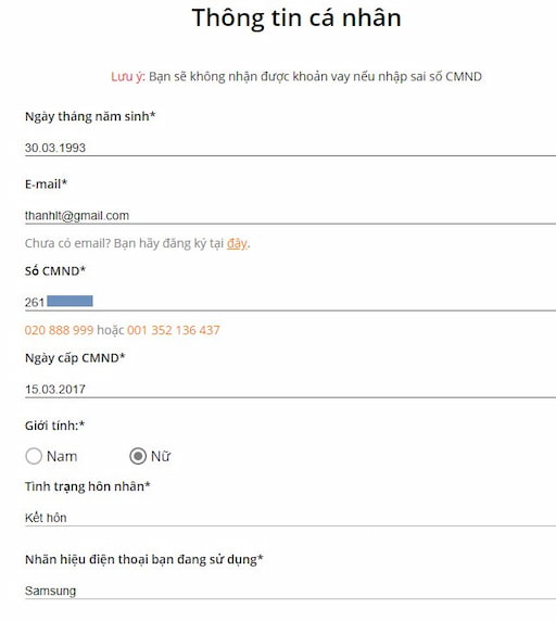 - Bước 2: Cung cấp lần lượt các thông tin cá nhân theo yêu cầu bao gồm: Email, CMND, Ngày tháng năm sinh, Giới tính, Tình trạng hôn nhân, Nhãn hiệu điện thoại đang sử dụng.