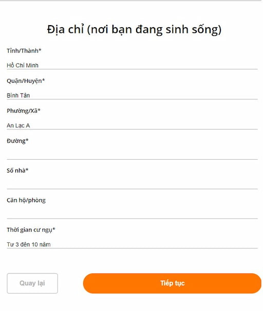 - Bước 3: Sau đó tiếp tục điền thông tin về địa chỉ tạm trú của bạn bao gồm Tỉnh/thành, Quận/huyện, Phường/xã, Đường, Số nhà và thời gian cư trú.