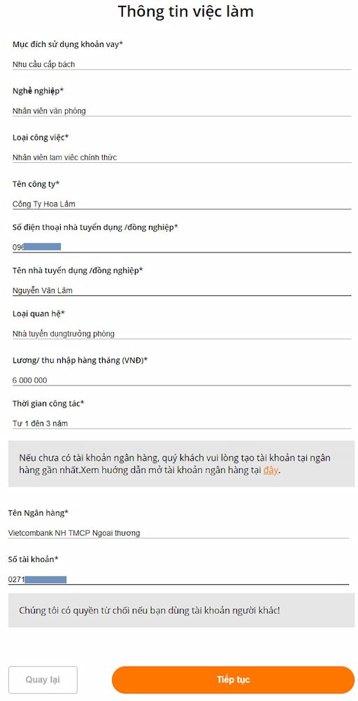 - Bước 4: Cung cấp các thông tin liên quan đến việc làm bao gồm: Mục đích sử dụng khoản vay. Nghề nghiệp, Loại công việc, Tên công ty, Số điện thoại nhà tuyển dụng/đồng nghiệp. Tên nhà tuyển dụng/đồng nghiệp.Mức lương hàng tháng, Thời gian công tác. Tên ngân hàng và số tài khoản đang còn hiệu lực để giao dịch.