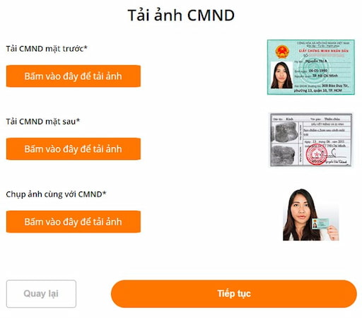 - Bước 5: Tiếp đó, công ty sẽ yêu cầu bạn cung cấp hình ảnh CMND bằng cách tải mặt trước, mặt sau và một bức ảnh mà bạn cầm CMND của mình để làm hồ sơ xác thực. Sau đó bấm vào ô tiếp tục.