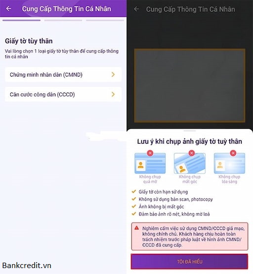 - Bước 3: Chọn loại giấy tờ tùy thân để xác định danh tính: CCCD hoặc CMND. Đọc phần hướng dẫn từ hệ thống và bấm mục “Tôi đã hiểu” để bắt đầu.