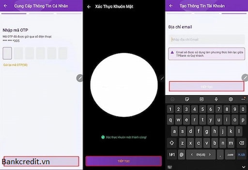 - Bước 5: Nhập mã OTP được gửi vào số điện thoại mà bạn cung cấp ban đầu để xác thực. Tiếp tục lia Camera khuôn mặt theo sự hướng hướng dẫn để hệ thống đối chiếu. Sau đó nhập địa chỉ Email cá nhân và bấm tiếp tục.