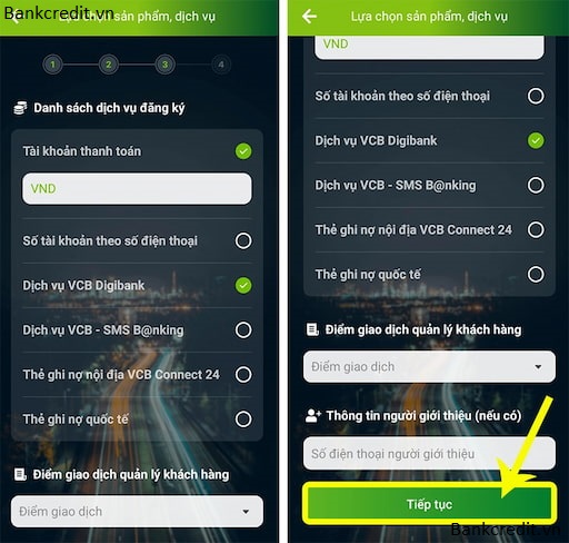 - Bước 6: Lựa chọn dịch vụ và sản phẩm mà bạn mong muốn mở tài khoản Vietcombank. Rồi nhấn “Tiếp tục” thêm lần nữa.