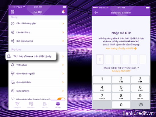 Bước 1: Đăng nhập tài khoản vào app TPBank trên thiết bị mới, sau đó chọn “Tích hợp ngay” để kích hoạt mã eToken+.