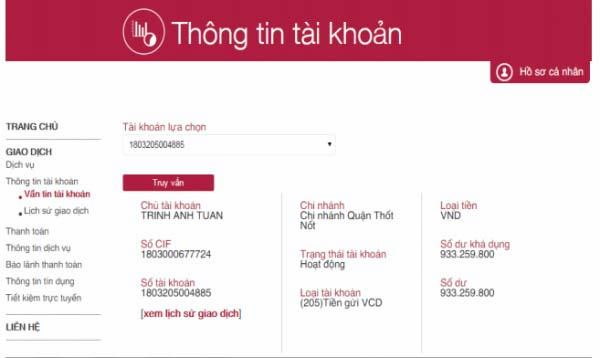 - Bước 3: Sau đó, chọn mục “Giao dịch – Thông tin tài khoản – Vấn tin tài khoản” để kiểm tra số tiền trong tài khoản là bao nhiêu? Phía dưới mục vấn tin, bạn bấm vào Xem lịch sử giao dịch.